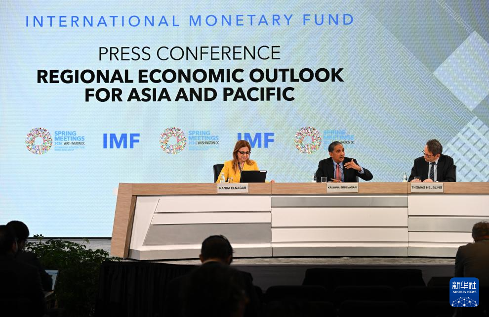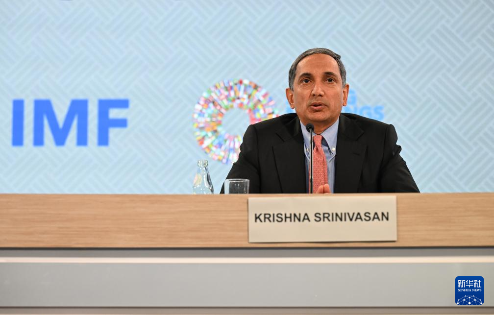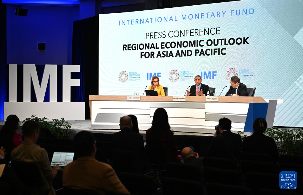 4月16日,在美国华盛顿,国际货币基金组织(IMF)亚太部主任斯里尼瓦桑(中)在新闻发布会上讲话。