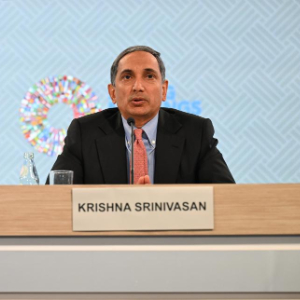 4月16日,在美国华盛顿,国际货币基金组织(IMF)亚太部主任斯里尼瓦桑在新闻发布会上讲话。