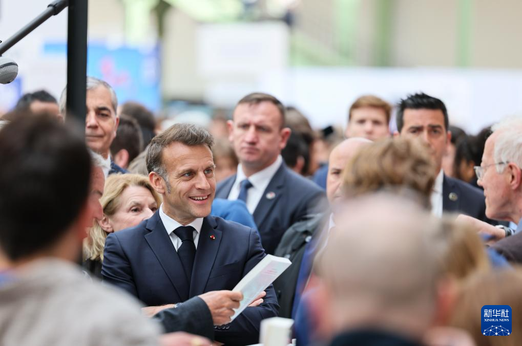 4月17日,在法国巴黎大皇宫,法国总统马克龙在巴黎图书节上参观。