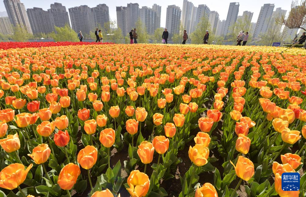 4月17日,游客在甘肃省临夏回族自治州永靖县刘家峡镇黄河花堤赏花游览。