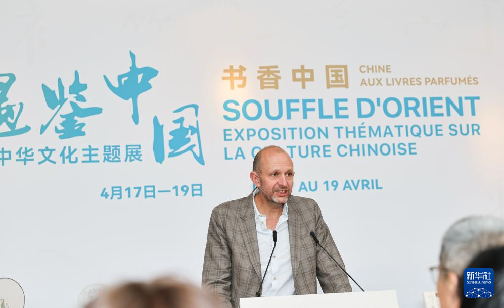 4月17日,在法国巴黎大皇宫,欧洲出版企业达高集团首席执行官朱利安·帕普利耶在“遇鉴中国”中华文化主题展开幕式上致辞。