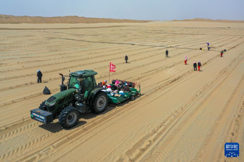 在新疆和田地区于田县阗东防沙治沙示范区,当地村民驾驶机械移栽玫瑰和黄芩,并铺设滴灌带(4月15日摄,无人机照片)。
