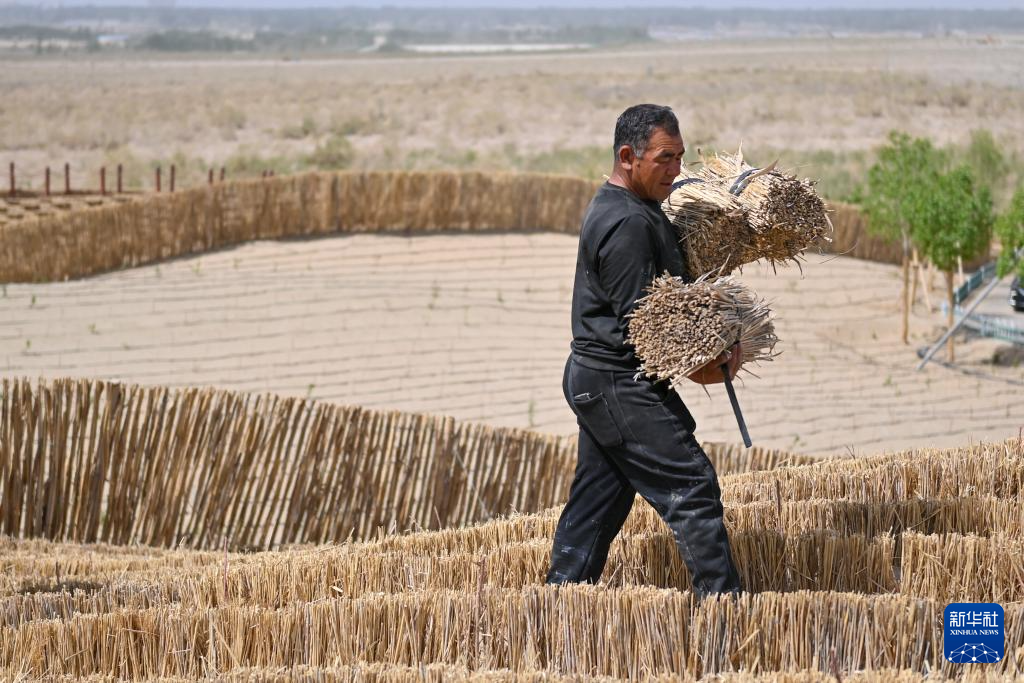 在新疆和田地区于田县阗东防沙治沙示范区,村民搬运制作草方格的芦苇(4月15日摄)。