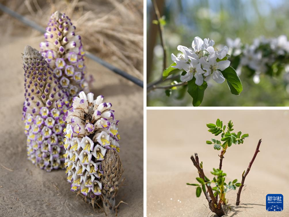 拼版照片:右上为在新疆阿克苏市丰庆园农民专业合作社示范园拍摄的苹果花(4月14日摄);右下为在新疆和田地区于田县阗东防沙治沙示范区拍摄的玫瑰花苗(4月15日摄);左为在新疆仙草蓉科技有限公司防沙治沙荒漠植物示范园拍摄的肉苁蓉(4月13日摄)。