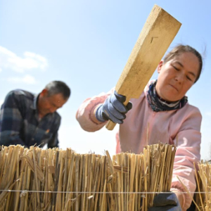 在新疆和田地区于田县阗东防沙治沙示范区,村民制作草方格(4月15日摄)。