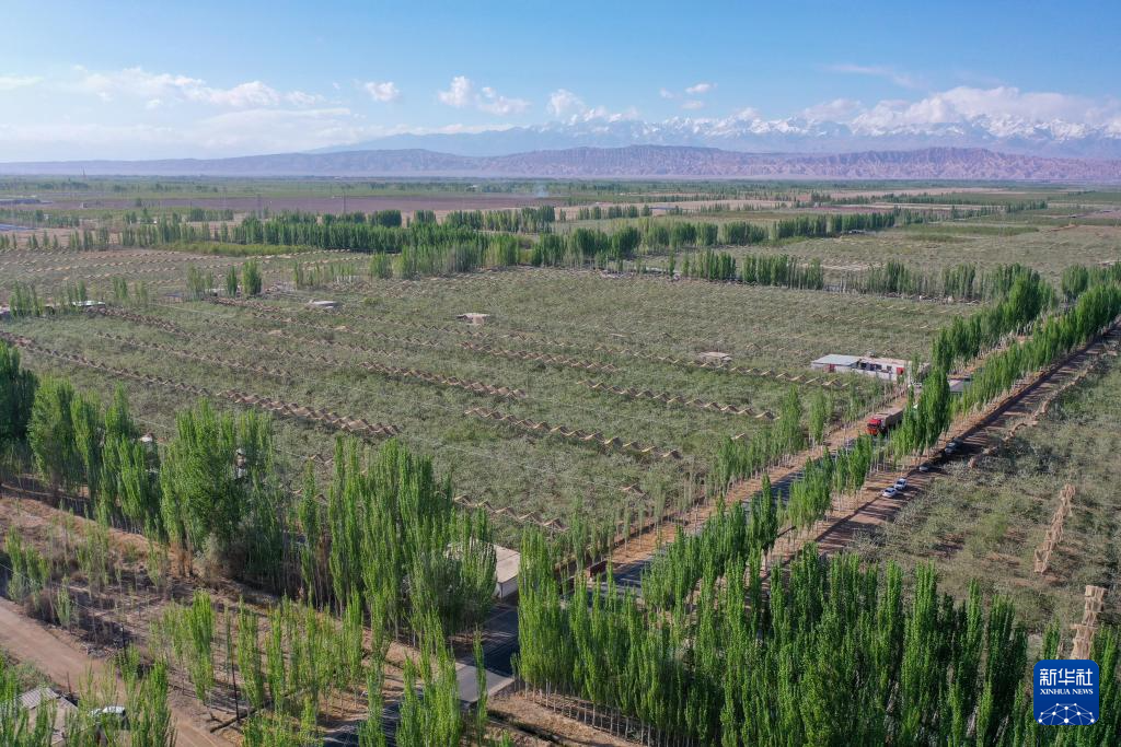 在新疆和田地区和田县三万亩群众防沙治沙区,当地在开心果林地套种南瓜(4月16日摄,无人机照片)。