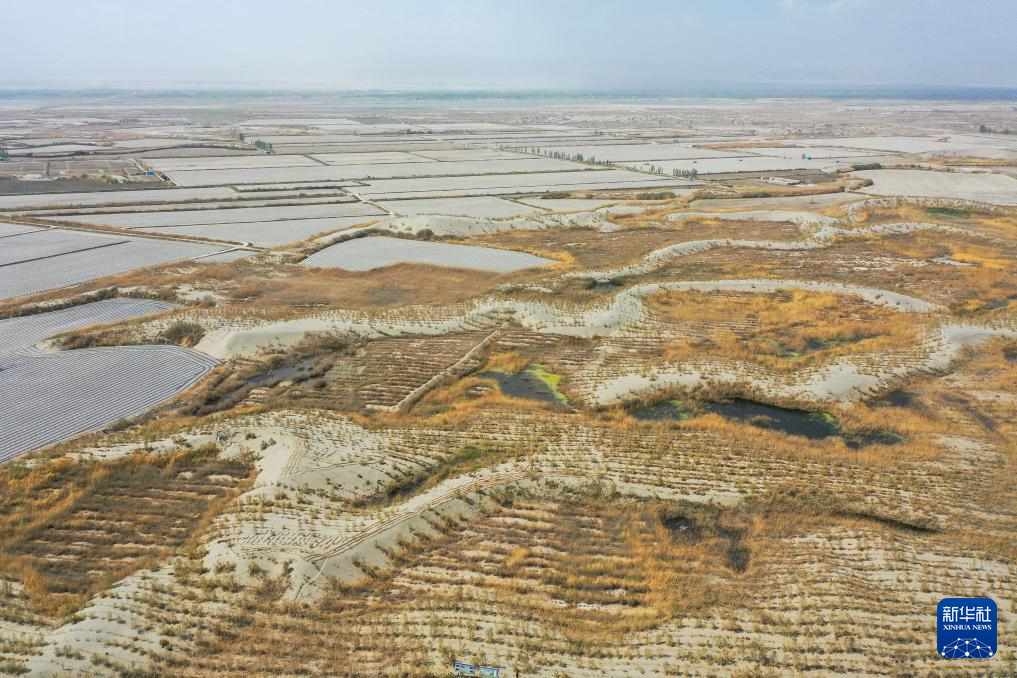 这是新疆阿克苏地区阿瓦提县艾西曼区域生态修复及荒漠化治理工程区一角(4月14日摄,无人机照片)。