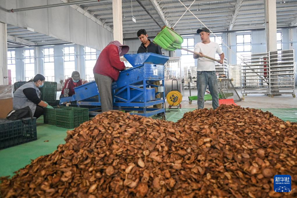 在新疆阿克苏鑫奕泽农业科技有限公司,工人在分拣肉苁蓉切片(4月14日摄)。