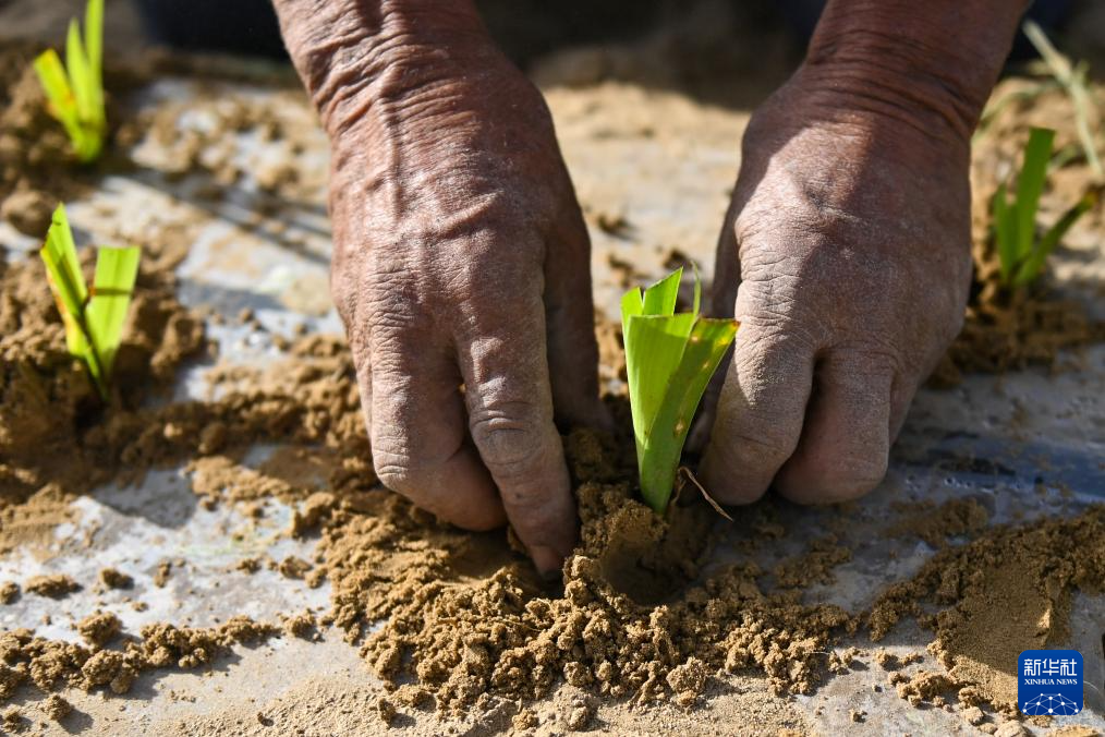 在新疆和田地区于田县万花园防沙治沙示范区,村民栽种中药材射干(4月15日摄)。