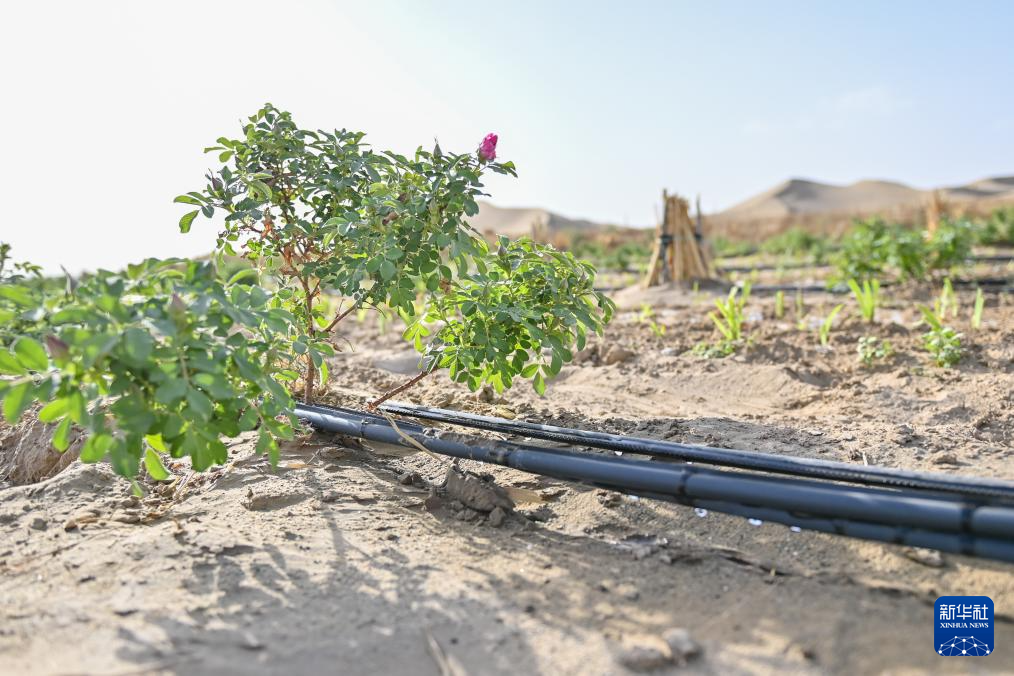 在新疆和田地区于田县万花园防沙治沙示范区,村民在玫瑰种植区套种中药材射干(4月15日摄)。