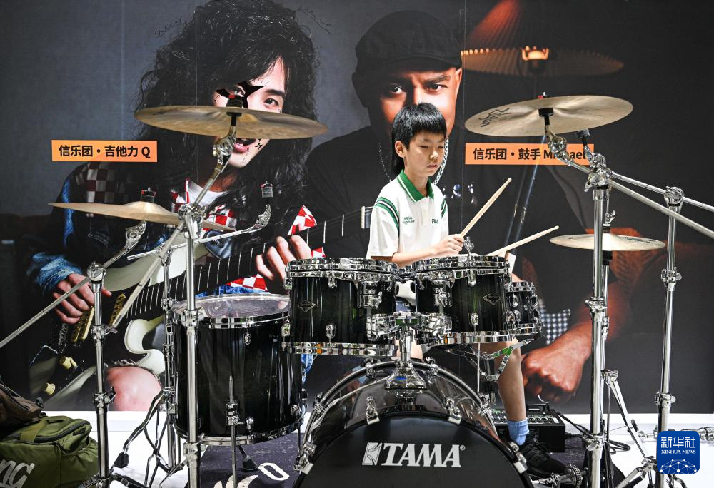4月18日,参观者在第六届消博会体验乐器。