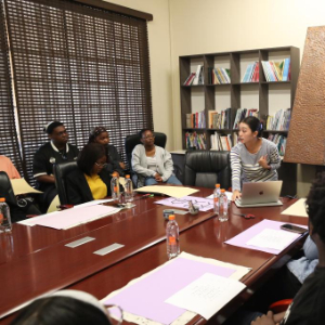 4月17日,在南非约翰内斯堡,约翰内斯堡大学孔子学院的教师在“国际中文日”文化交流活动上向当地学生介绍中国汉字。