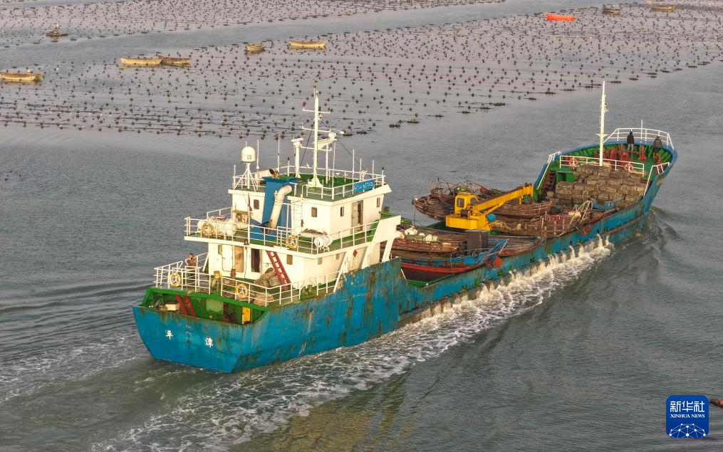 4月18日,满载鲍鱼的运输船前往山东省荣成市爱伦湾卸运(无人机照片)。