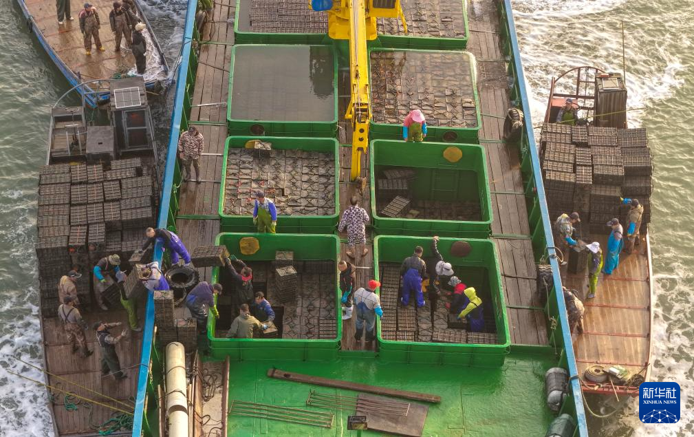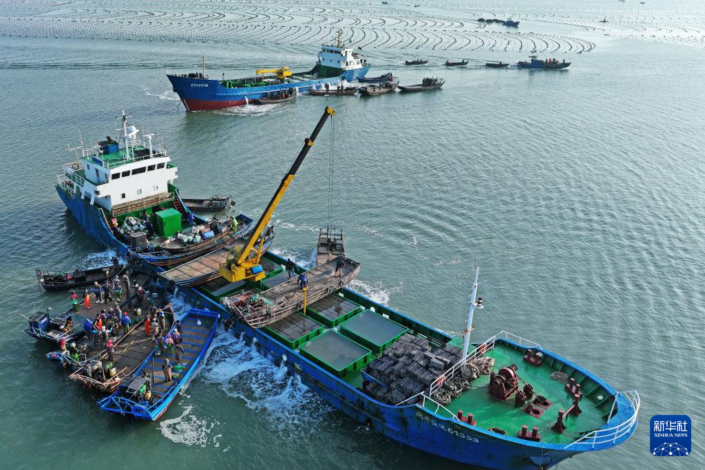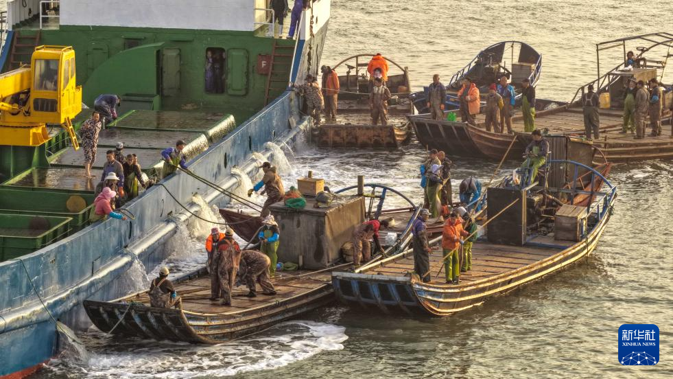 4月18日,在山东省荣成市爱伦湾,养殖工人将从福建海域“越冬”归来的鲍鱼转运到养殖海域(无人机照片)。