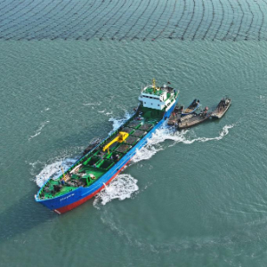 4月18日,在山东省荣成市爱伦湾,养殖工人将从福建“越冬”归来的鲍鱼转运到养殖海域(无人机照片)。