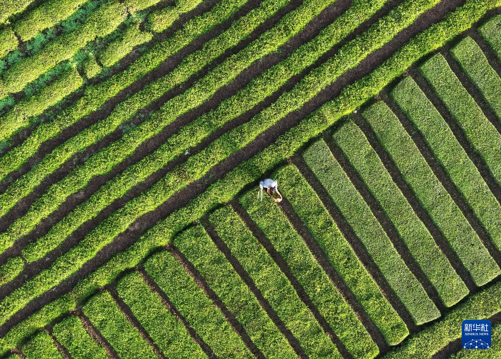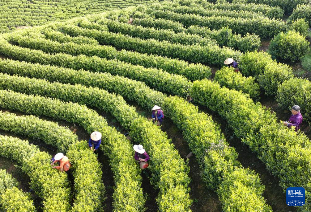 4月18日,在湖南省衡山县开云镇,当地村民在茶场采摘春茶(无人机照片)。
