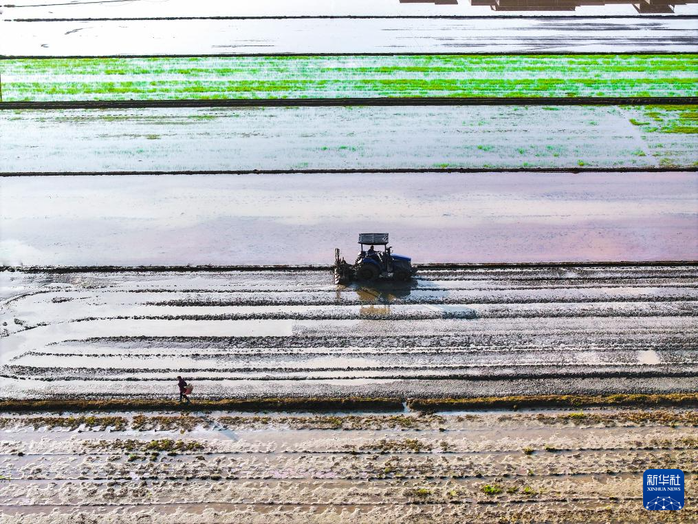 4月18日,在黑龙江省富锦市万亩水稻公园,种植户驾驶农机进行打浆作业(无人机照片)。