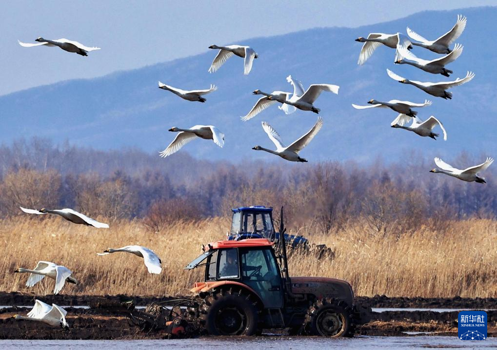 4月18日,在黑龙江省同江市的一处水田里,正在作业的农机和起飞的天鹅同框。
