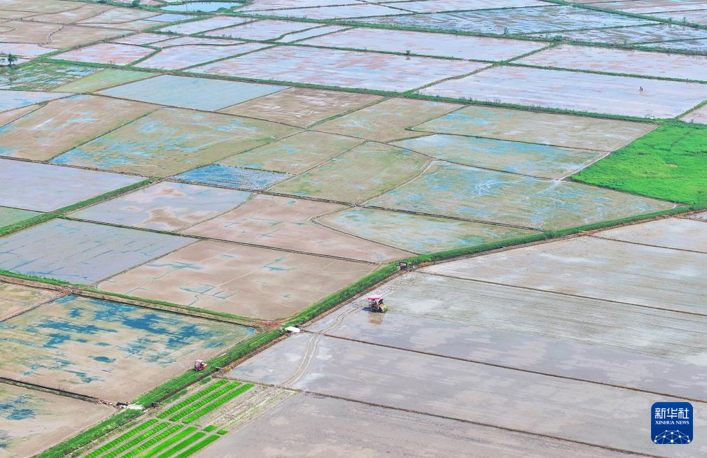 4月19日,在湖南省衡阳市衡阳县西渡镇梅花村,农民驾驶插秧机在进行水稻插秧作业(无人机照片)。