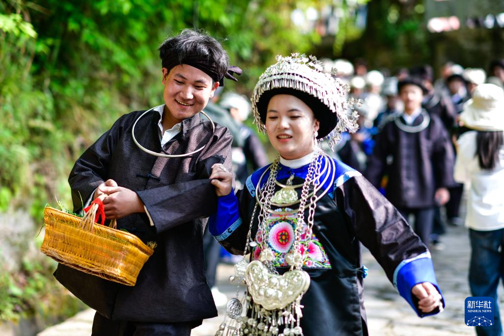 4月19日,侗族青年在贵州省镇远县报京侗寨参加“三月三”讨葱定情活动。