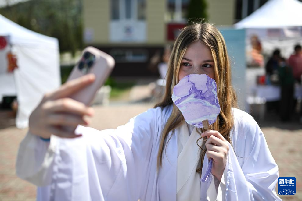 4月20日,在哈萨克斯坦阿拉木图,一名身着中国传统服饰的学生在自拍。