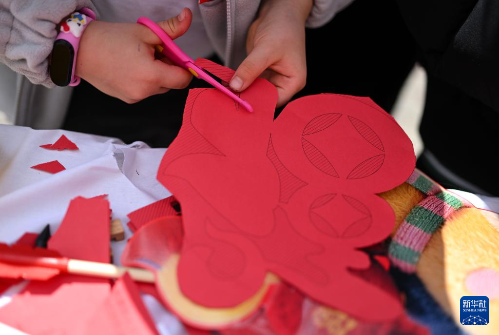 4月20日,在哈萨克斯坦阿拉木图,一名学生体验中国剪纸。