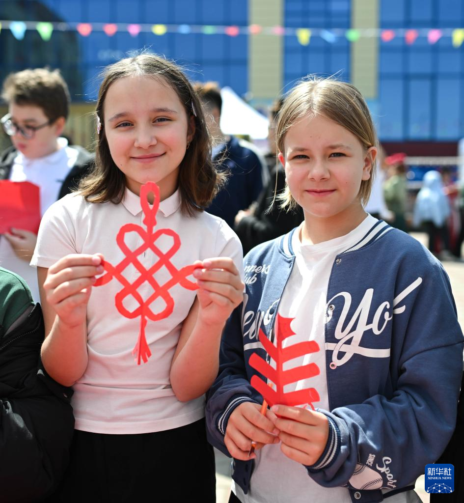 4月20日,在哈萨克斯坦阿拉木图,学生展示剪纸作品。