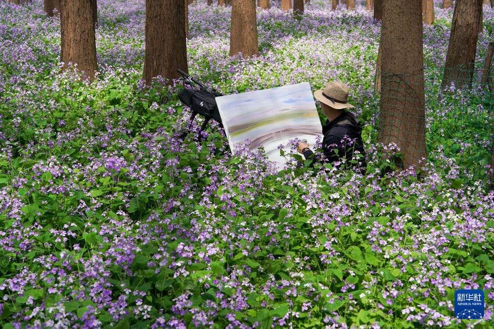 一位市民在南京市建邺区江心洲池杉林写生画画(2026年3月28日摄)。