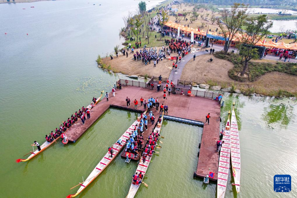 朱海休闲运动小镇举办淮海经济区龙舟邀请赛(2025年10月26日摄)。江苏省宿迁市王官集镇的朱海休闲运动小镇是在朱海水环境治理基础上打造的生态旅游项目,项目总占地约8900亩。朱海曾一度因养殖尾水问题而背上了沉重的“生态包袱”。2020年,朱海启动水环境综合整治项目,实施水系连通工程,曾经的“一潭死水”变为流动的活水。