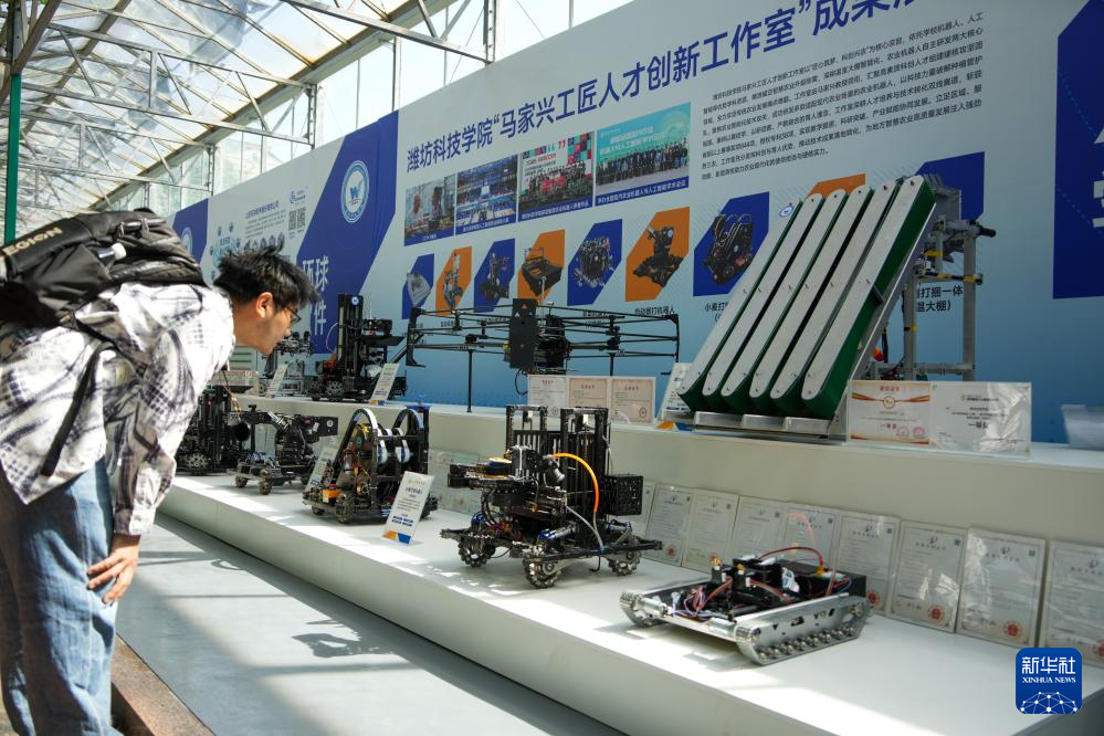 4月20日,参观者在蔬菜科技博览会上观看农用机器人。