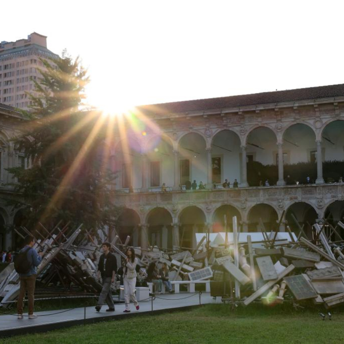 4月20日,在意大利米兰大学,人们参观米兰设计周展品。