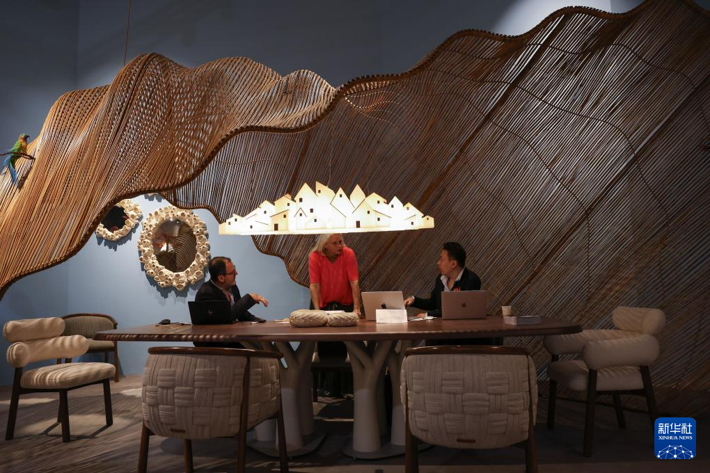 4月21日,在意大利米兰国际会展中心,展商在米兰家具展上洽谈。
