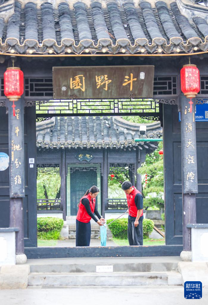 4月22日,在江苏省扬州市江都区邵伯镇,当地文明实践中心志愿者在捡拾垃圾。