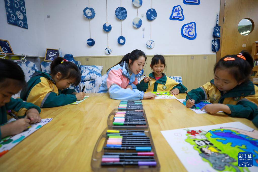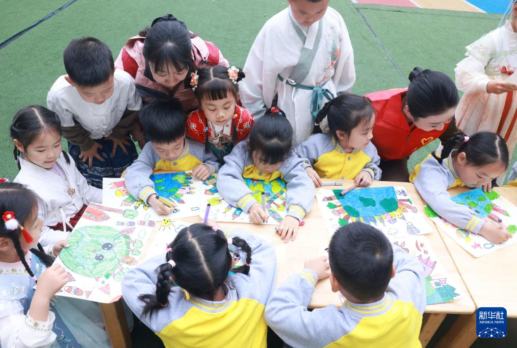 4月22日,在湖北省武汉市江岸区百步亭快乐天使幼儿园,孩子们以画笔绘山河。