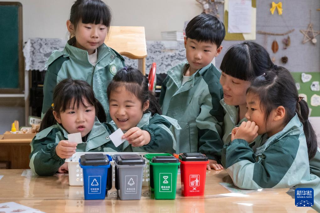 4月21日,在安徽省芜湖市繁昌区春谷幼儿园,小朋友学习垃圾分类知识。