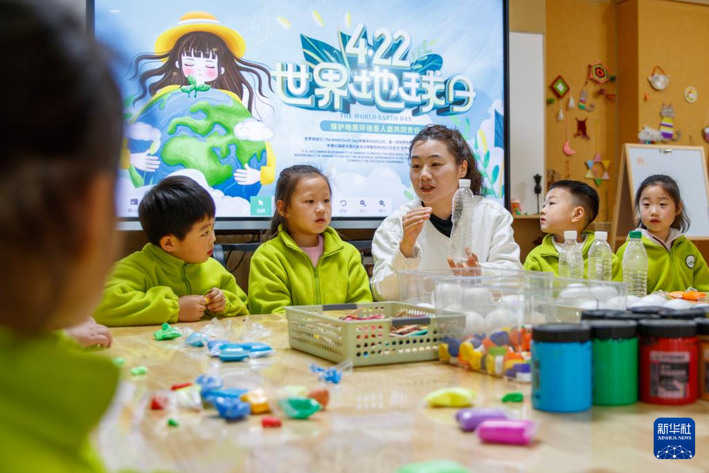 4月21日,在河南省商丘市睢县古襄路幼儿园“童心护地球 共绘绿色梦”主题活动现场,小朋友学习环保科普知识,参与“变废为宝”手工制作。