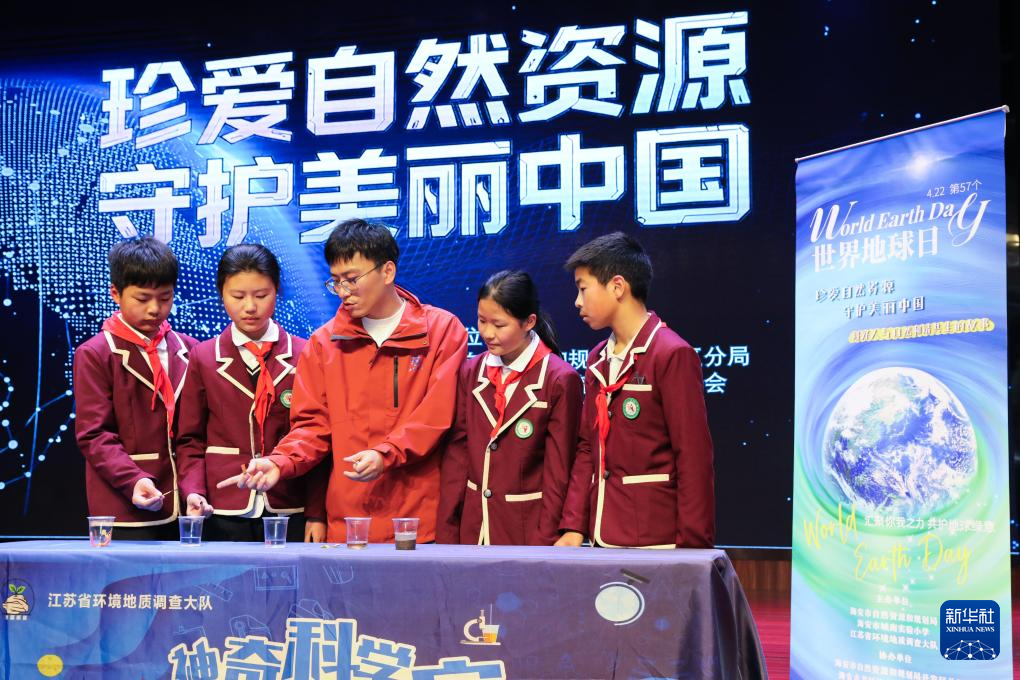 4月21日,地质工作者在江苏省海安市城南实验小学指导同学们进行科学小实验。