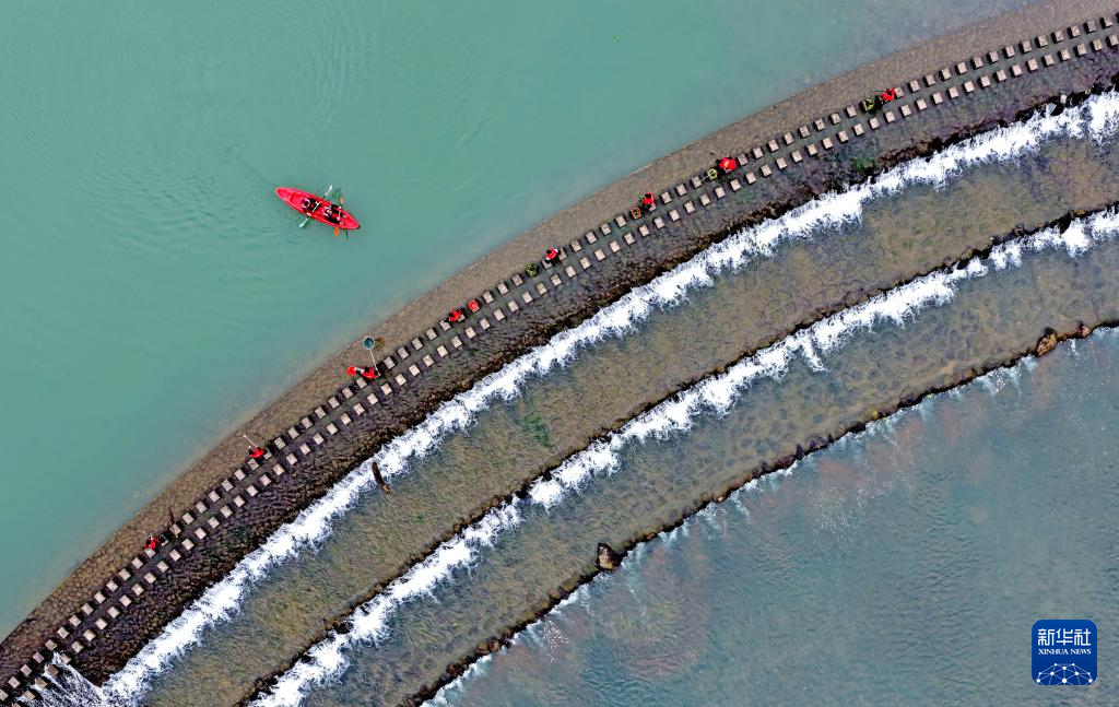 4月21日,浙江省交通集团高速公路台州市仙居收费站党员、志愿者与河长一起在仙居县永安溪清理杂物垃圾、打捞水面漂浮物(无人机照片)。