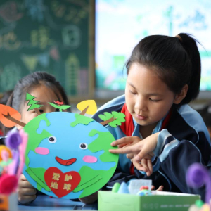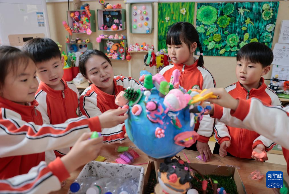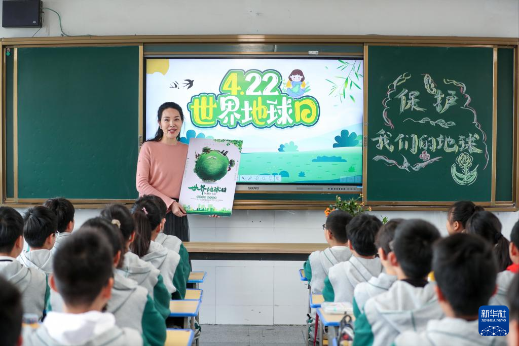 4月22日,在江苏省泰州市姜堰区康华小学,老师给学生讲解保护地球的相关知识。