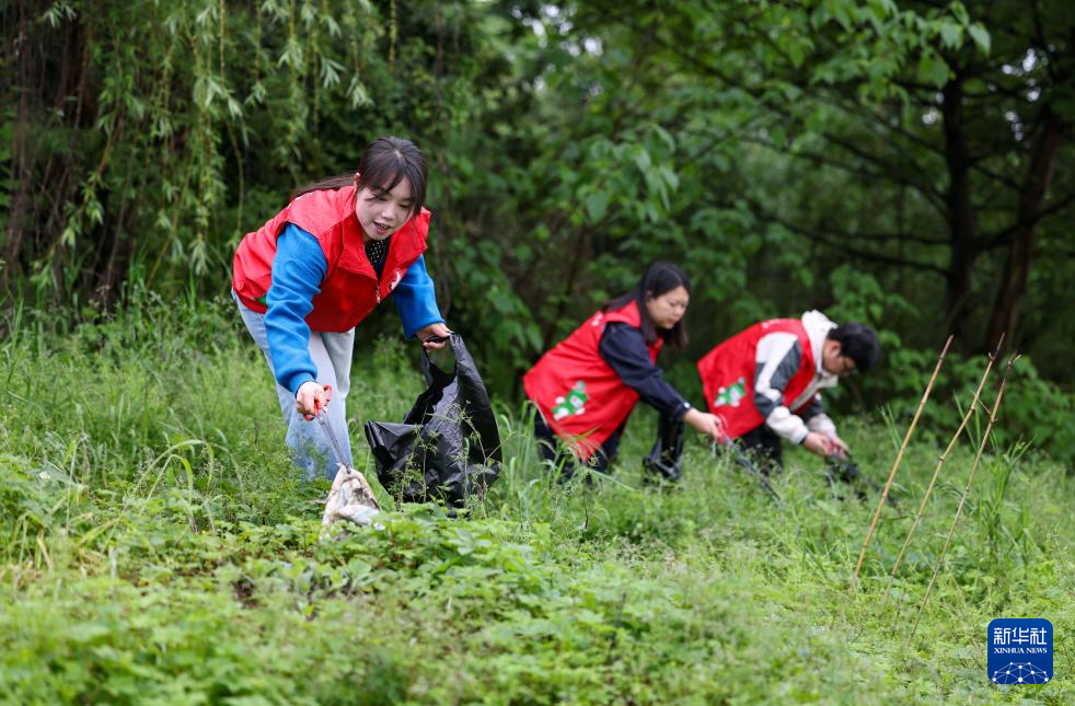 4月22日,青年志愿者在贵州省铜仁市玉屏侗族自治县㵲阳河沿岸捡拾垃圾。