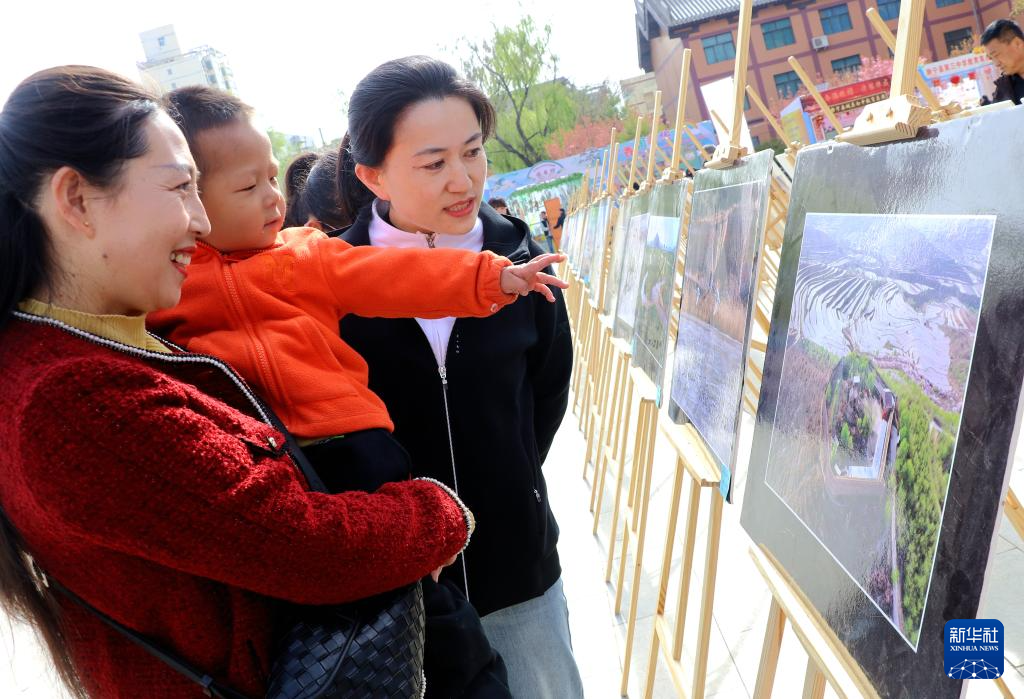 4月22日,在甘肃省平凉市静宁县成纪文化城广场,群众在欣赏“静宁风情”摄影展。
