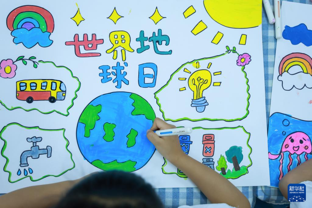 4月22日,贵州省黔南布依族苗族自治州罗甸县莲花幼儿园的小朋友在进行世界地球日主题绘画创作。