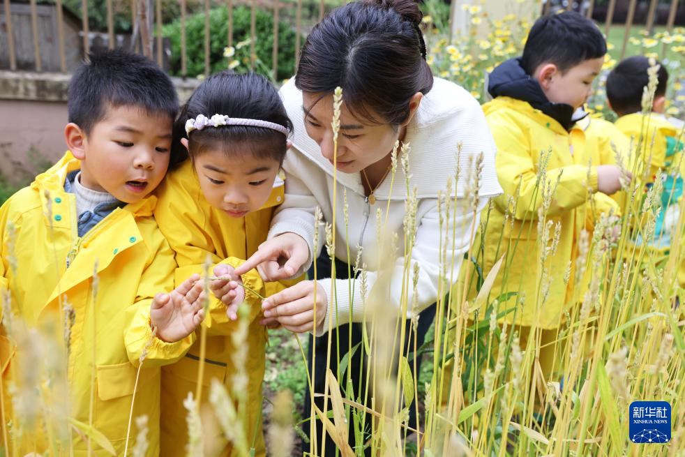 4月21日,在浙江省湖州市德清县乾元镇第一幼儿园农场,老师给小朋友介绍小麦生长情况。