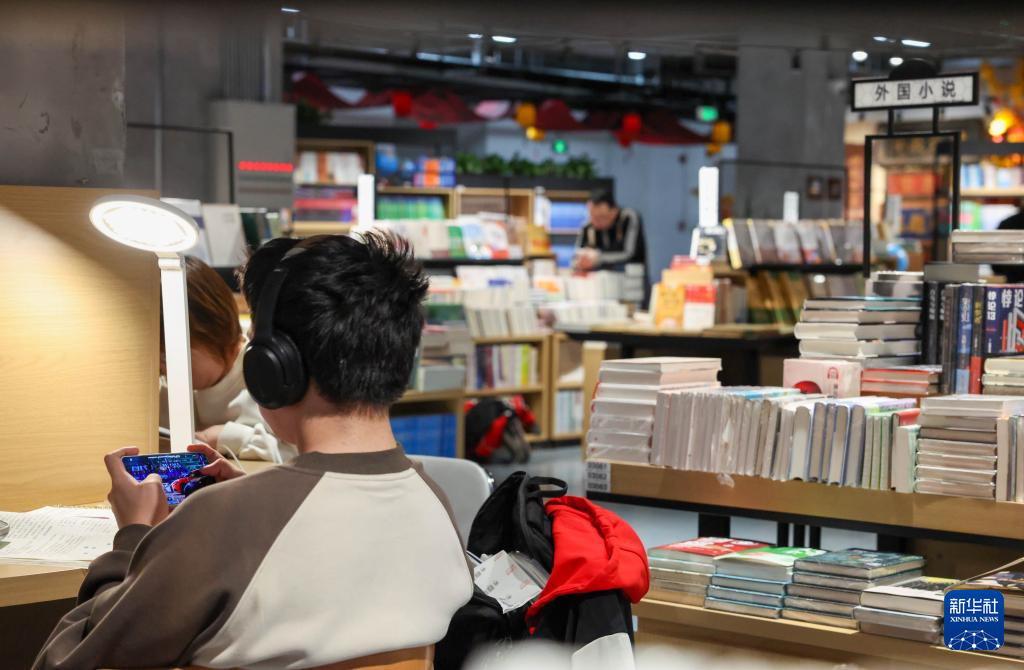 4月19日,市民在吉林长春一家书店玩手机游戏。