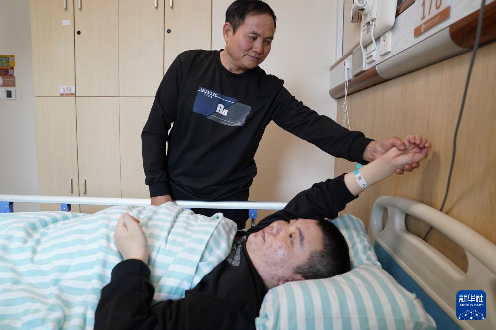 2025年12月15日,邓先生在接受脑机接口手术前,家人在帮助他活动身体,此时他的手臂只能微动,双手无法活动。
