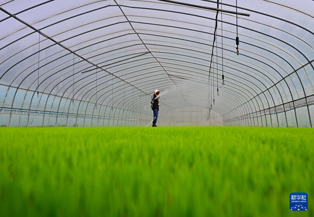4月23日,唐山市曹妃甸区第四农场的农民在大棚里管护水稻秧苗。