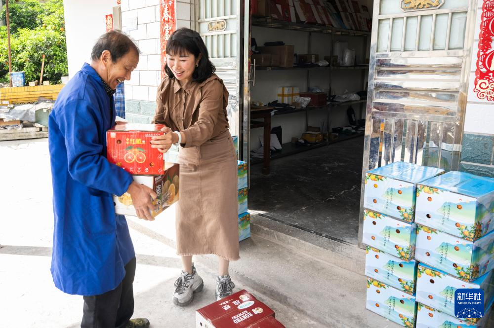 4月23日,周功寿(左)将包装好的脐橙送到村内的快递点发货给客户。