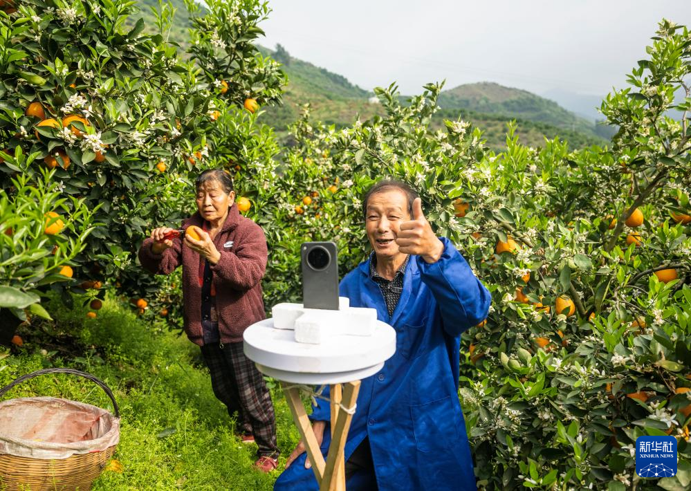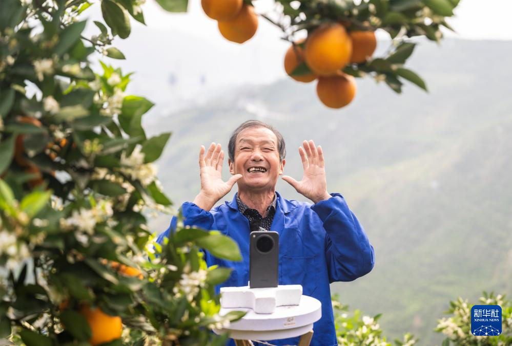 四月的三峡,峡江两岸山花遍野,沉甸甸的脐橙挂满枝头,花果同枝的盛景格外喜人。“大家好!我是秭归猴哥……”洪亮的声音从果园里传来——七旬老人周功寿正对着手机直播,脐橙的果香仿佛透过屏幕扑面而来。
