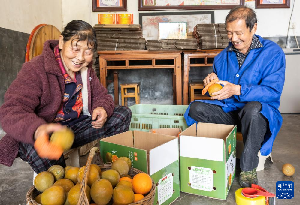 4月23日,周功寿(右)直播接单后,与老伴王学凤在自家客厅包装脐橙准备发快递。