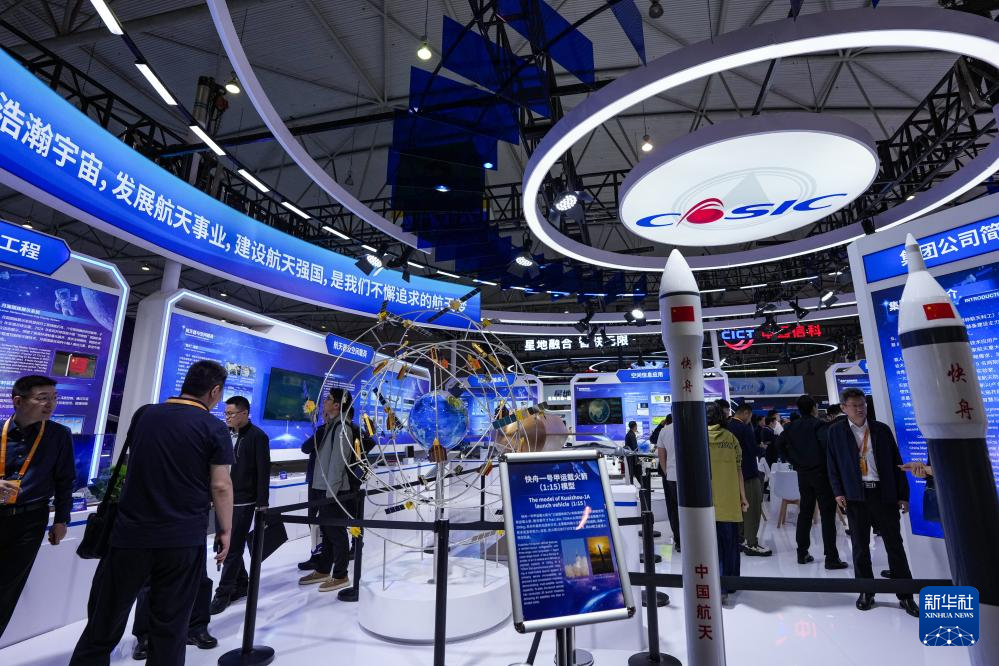 4月24日,参会嘉宾在航天科普展览四川航天展区参观卫星展品。